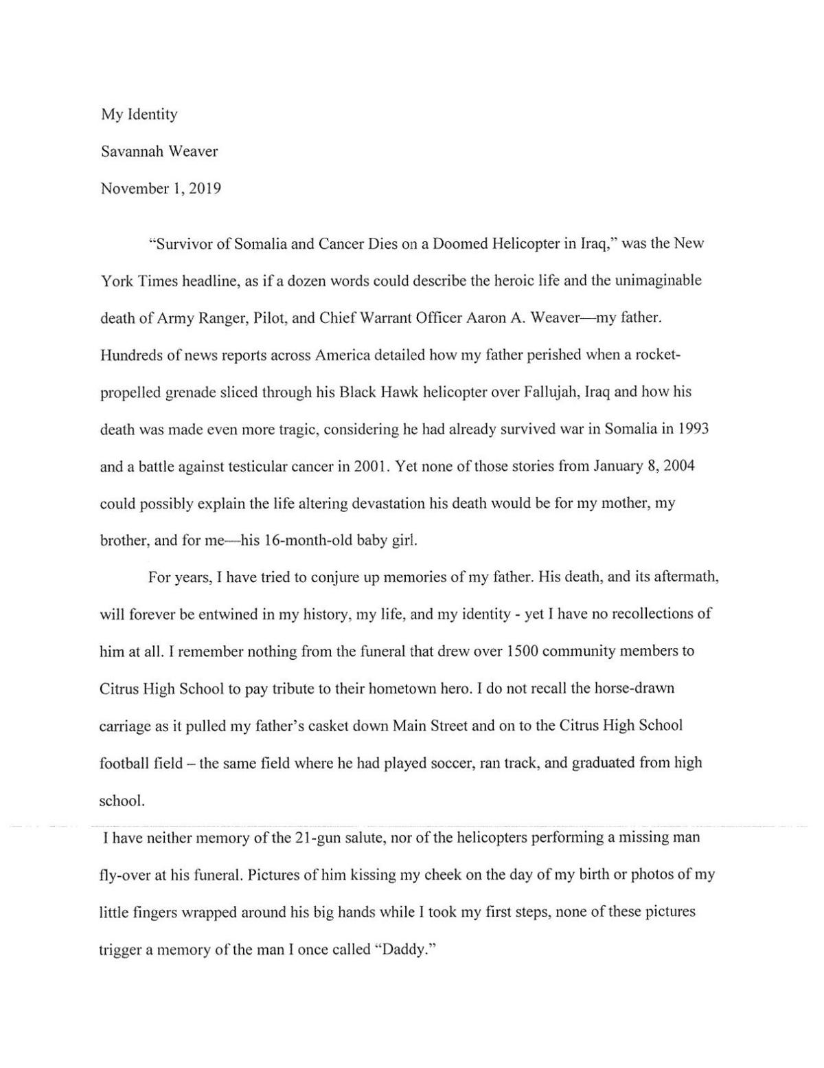 “I feel like I’m not used to expressing how it changed me and how I felt,” said the now 17-year-old Weaver, who will graduate this May from Citrus High. “I always have people telling me, ‘Your father was an amazing person.’ I never get to share my side.”That is until she had to pen an essay as part of her application for Florida State University. The topic: “What formed your identity?”