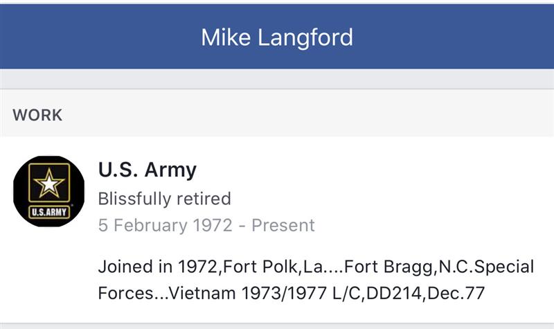 This Mike Langford was a member of a non-vetted SF forum on Facebook. he claimed to have been a Green Beret in Vietnamin 5th Group as an 18D (Special Forces Medic). The funny thing is, is he’s to young to live that lie and the 18 series hadn’t been established yet. He was born in 1955. SF left Vietnam in March of 1971, meaning he’d have had to have been about 15 when he entered the service to have been SF in Vietnam.