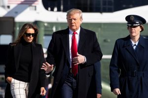 President Donald Trump, with first lady Melania Trump, wave as they walk across the tarmac to board Air Force One during their departure, Sunday, Feb. 23, 2020, at Andrews Air Force Base, Md. Trump is traveling to India. (Alex Brandon/AP)