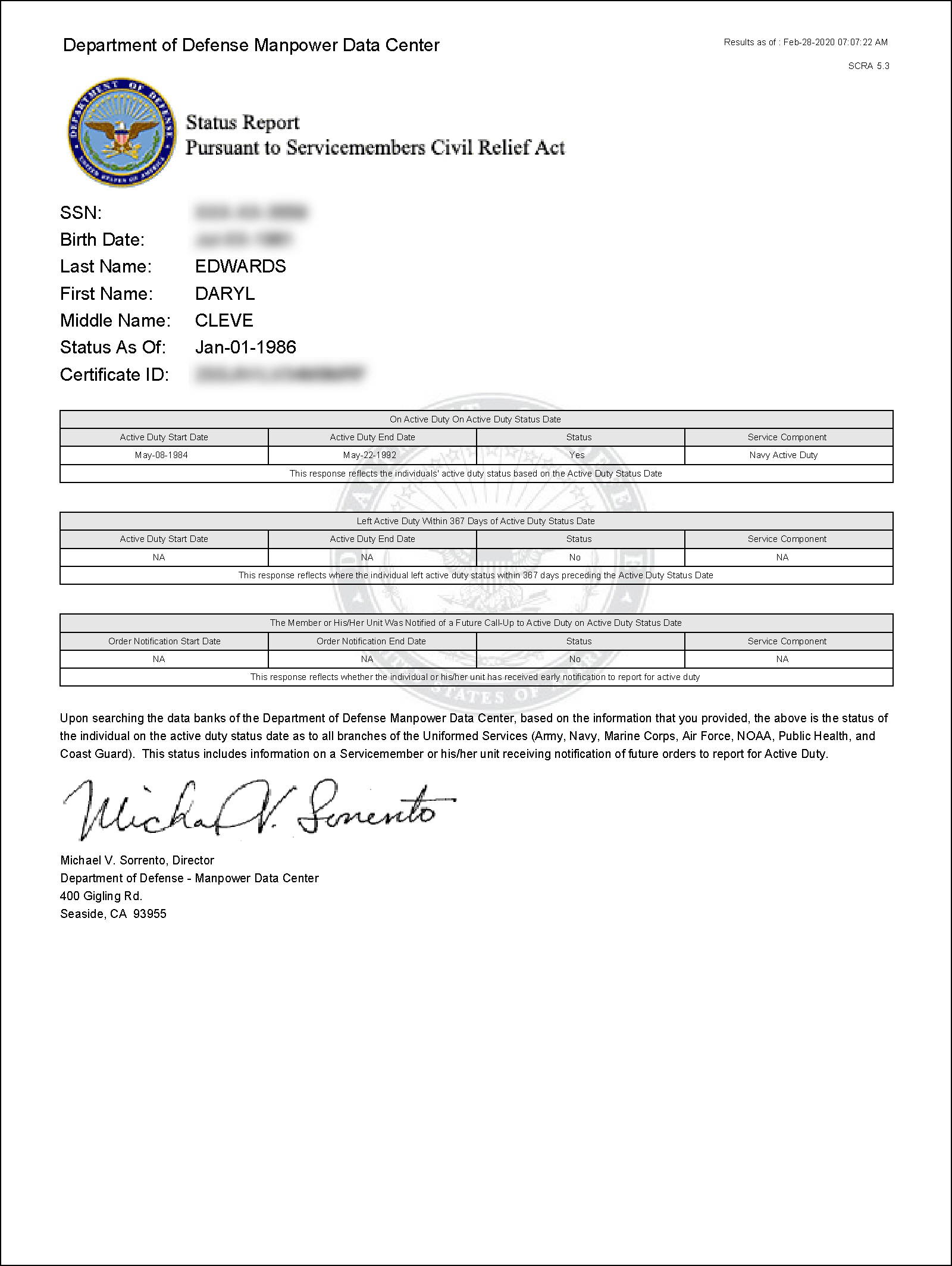 DEPARTMENT OF DEFENSE MANPOWER DATA CENTER (SCRA)