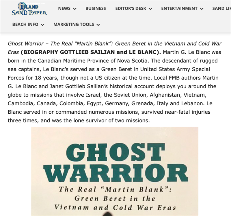 The final public meeting of the season for the Estero Island Historic Society will be held on MO Mar 9 at 7pm at St. Raphael’s Church, 5601 Williams Dr, FMB. Guest Speakers will be the authors of “Ghost Warrior – The Real ‘Martin Blank’ Green Beret in the Vietnam and Cold War Eras,” – Martin G. LeBlanc and Janet Gottlieb Sailian. Hear from a man present at some of the most volatile moments of the Vietnam and Cold War eras. Free admission with EIHS donations accepted.”