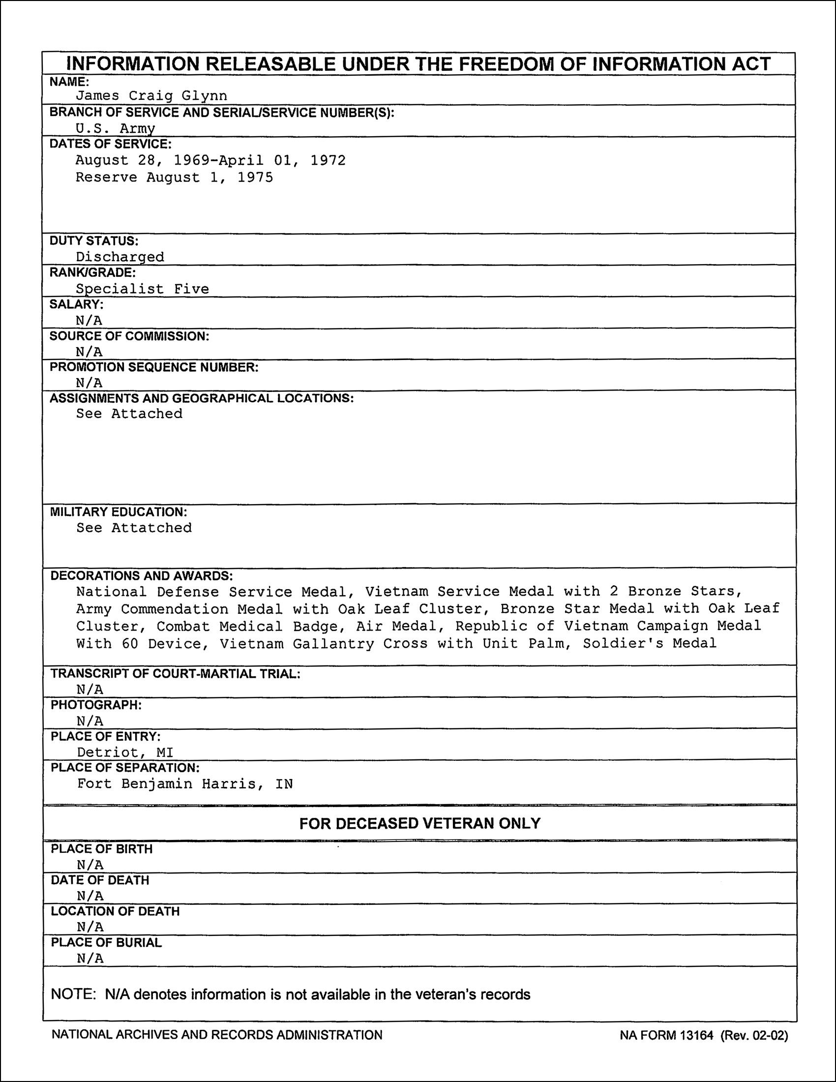 So there you have it – no MSG, no Somalia, no Iraq, no Afghanistan, no DSC, no Silver Stars, no Purple Hearts. He had two Bronze Star Medals (no “V” that I can see) but certainly not the 10 that was claimed.