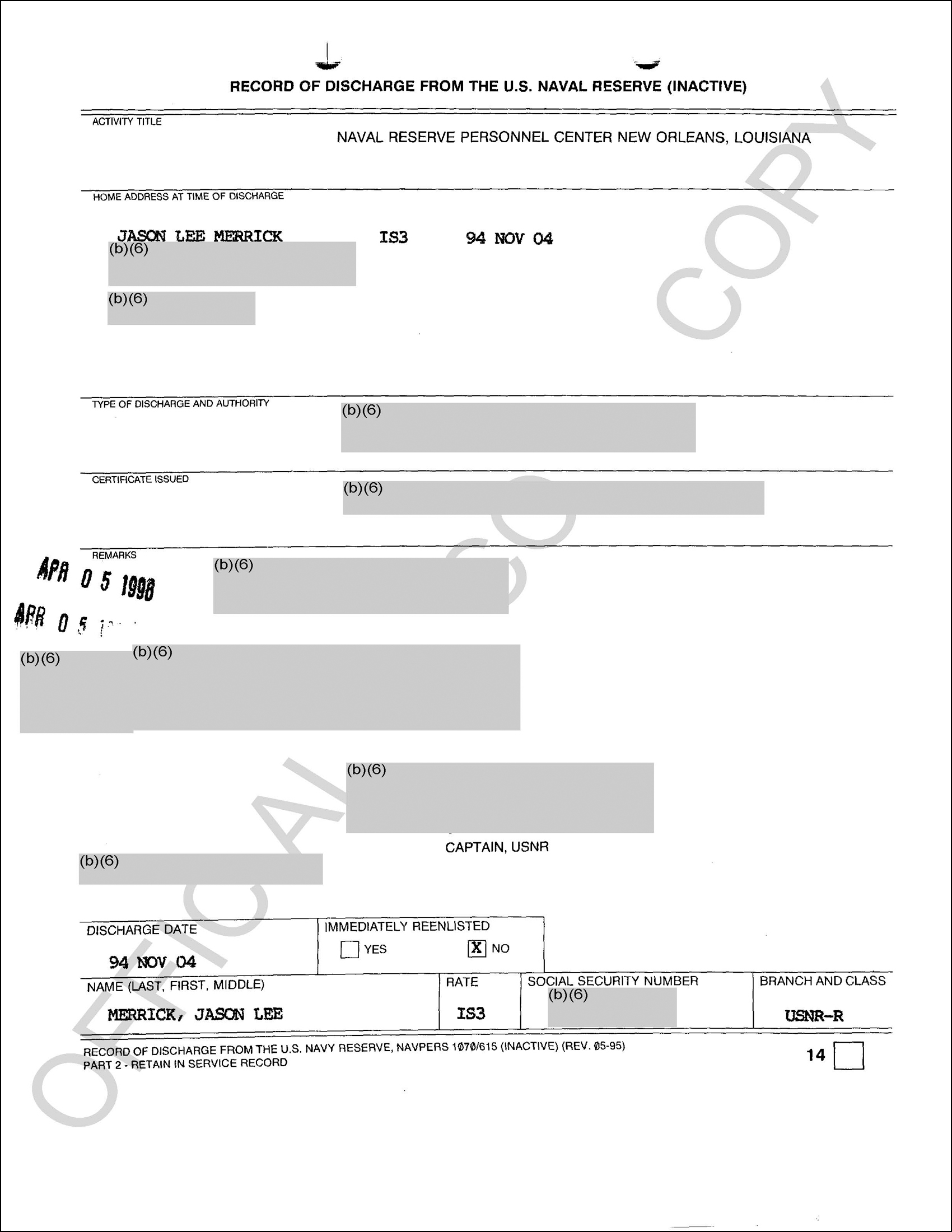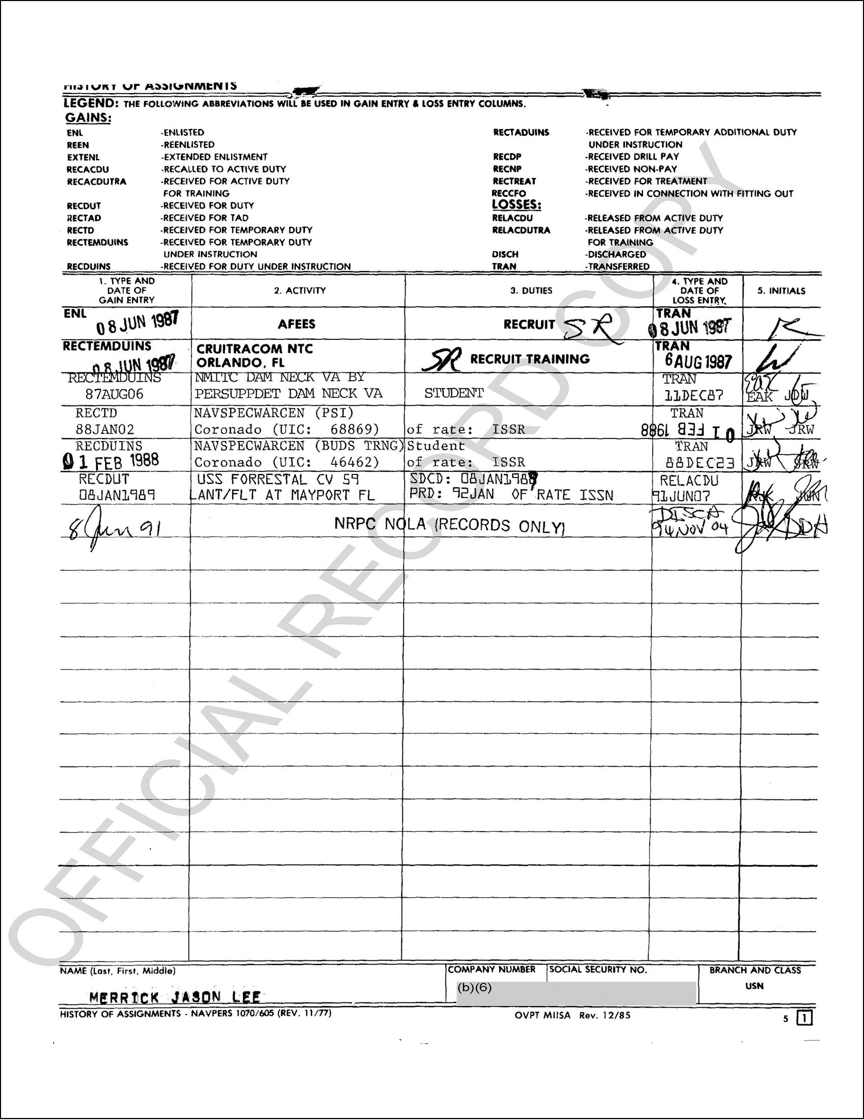 Jason Merrick’s official military records from the National Personnel Records Center (NPRC) do not support his claim of finishing BUD/S school.