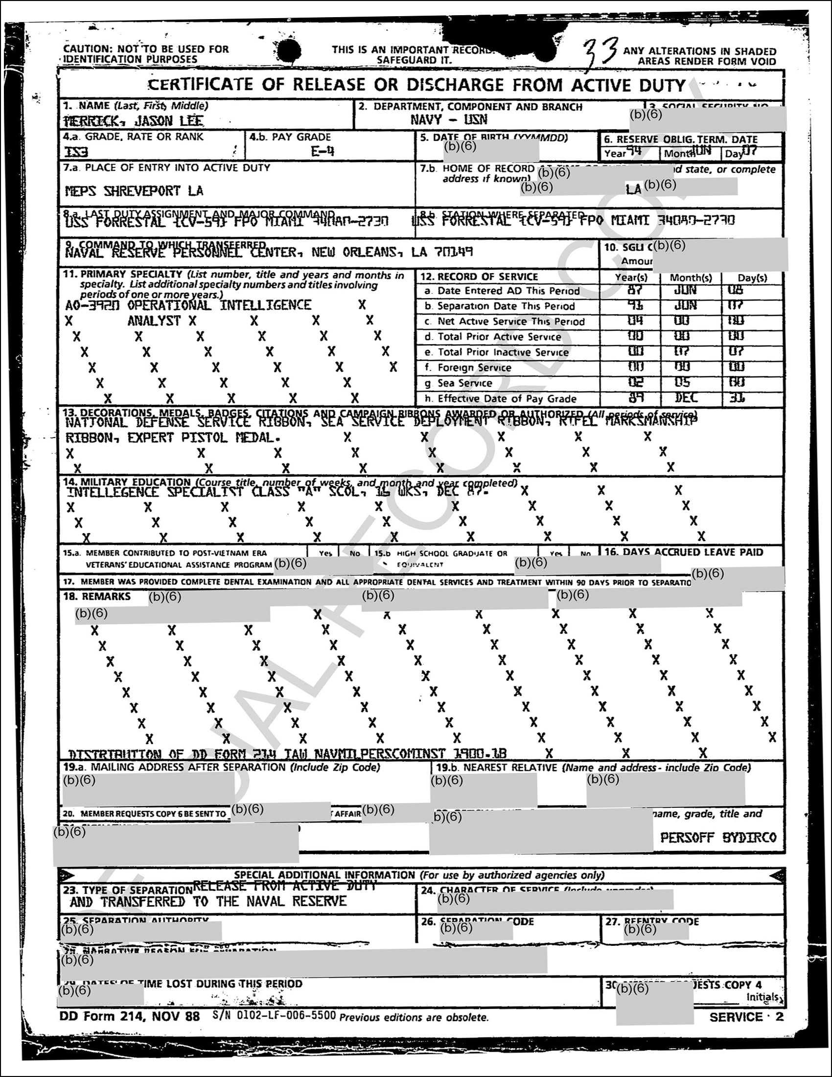2) You were awarded ZERO (0) NSW NEC’s per your OFFICIAL DD-214 (Block 11).