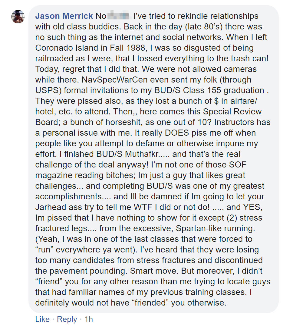 In spite of this, Merrick insists he “finished BUD/S” but was screwed out of graduation and these postings were all about trying to locate old classmates.