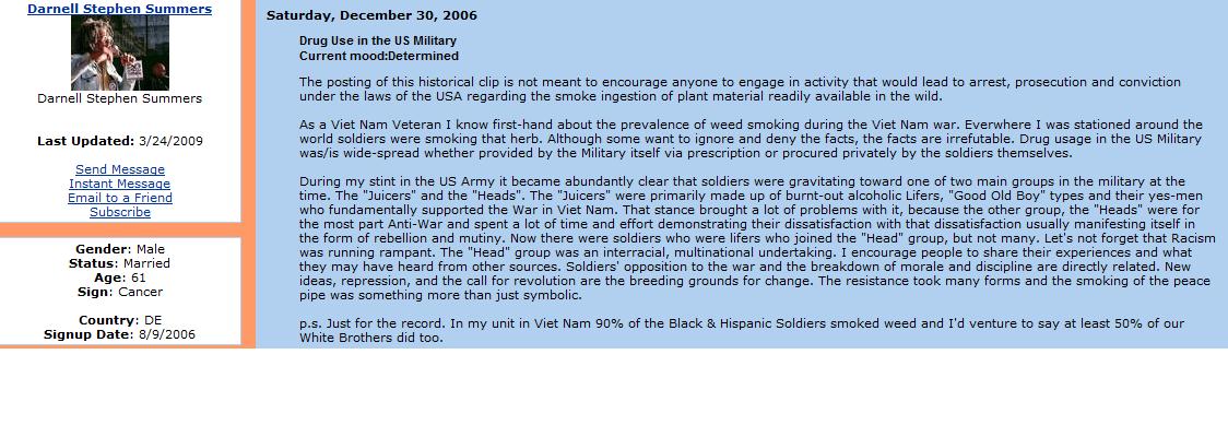 Well, for one thing, there are folks like IVAW who perpetuate that myth. In fact here’s a blog post of sorts from our friend, Major Ass Clown Darnell Stephen Summers, in which he perpetuates the myth that all Vietnam veterans were potheads because he was a pothead. And because he was a pothead and all of the IVAW ass clowns are potheads, then the whole military is a bunch of potheads. Well, except the old burnt out “lifers”, of course, who are all alcoholics;