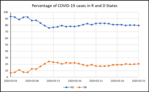 To analyze this phenomenon further, we calculated the percentage of COVID-19 cases for Democrat-governed states and Republican-governed states for the entire month of March. The historical data source used was the USA Facts. The chart below shows the results.