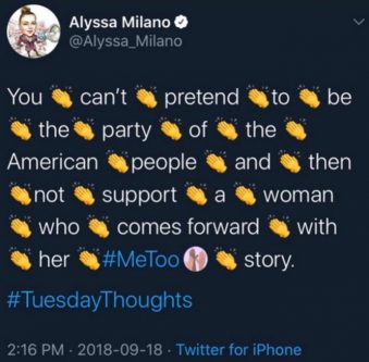Brett Kavanaugh won confirmation for a seat on the Supreme Court. Enter Alyssa Milano. She wrote a column for Variety listing what she felt was a setback for women… The institutionalizing of sexual assault. Additionally, she pointed to what she felt was a new trend against women.