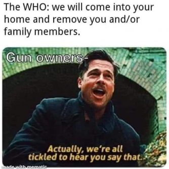 Yeah. I defy any WHO scumbag to show up at any residence of my family looking to remove someone from the household. The only thing that would be removed would be the WHO scumbag, feet first and in a rubber bag.