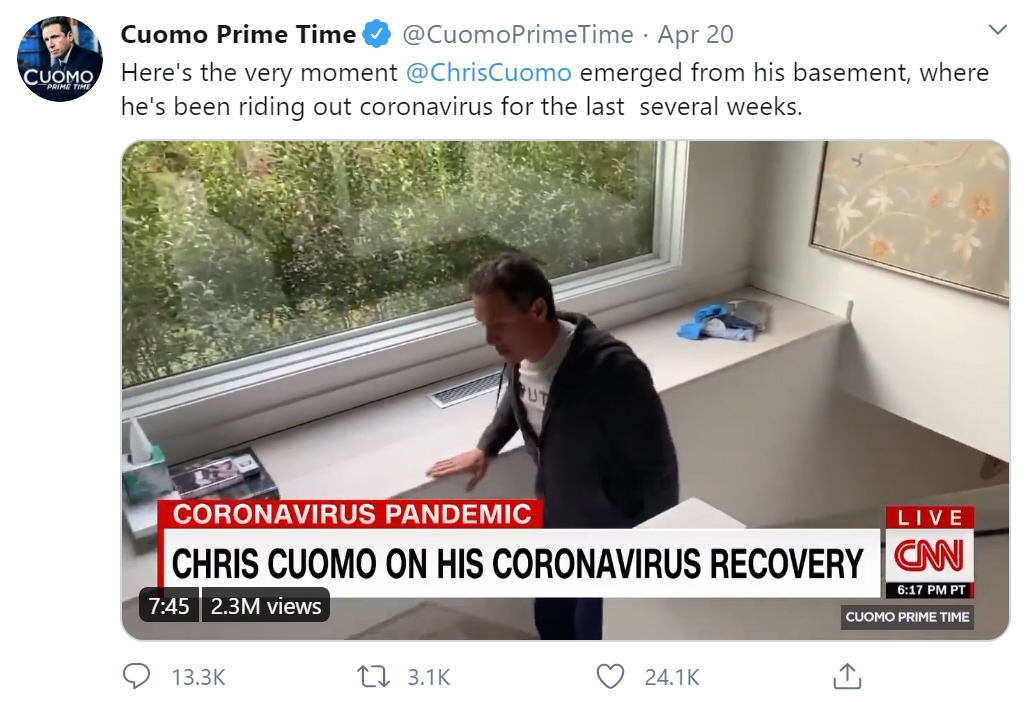 Chris Cuomo recently captured a video of himself emerging from his basement after a few weeks, which quite frankly was dramatically underwhelming. Cuomo produced several videos from his basement scolding encouraging everyone to strictly adhere to the virus quarantine guidance put out by his governor brother.