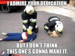 She starts yelling at a cop to give rescue breaths while she does chest compressions. The cop asks her if she wants him to go get the dude’s head first, but it goes right over hers. She log-rolls the headless body…and finally notices his rather obvious lack of anything from the neck up. Screaming. Hysteria. More screaming. Cops trying not to laugh.