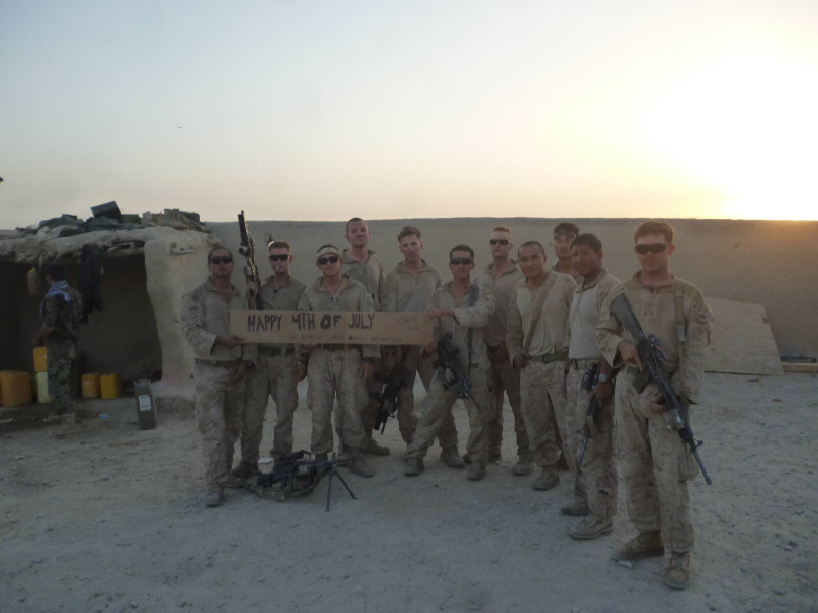 USMCE3TLCPL; I’m the oddball on the right side of the pic that almost looks like I was added in. (I swear I wasn’t. Even the guys in my platoon give me hell over that all the time for lookin’ like I don’t belong) as I remember it had hit over 130 degrees that day and we were unable to take any pics in clear daylight as we had all sought cover in the shade in the PB.